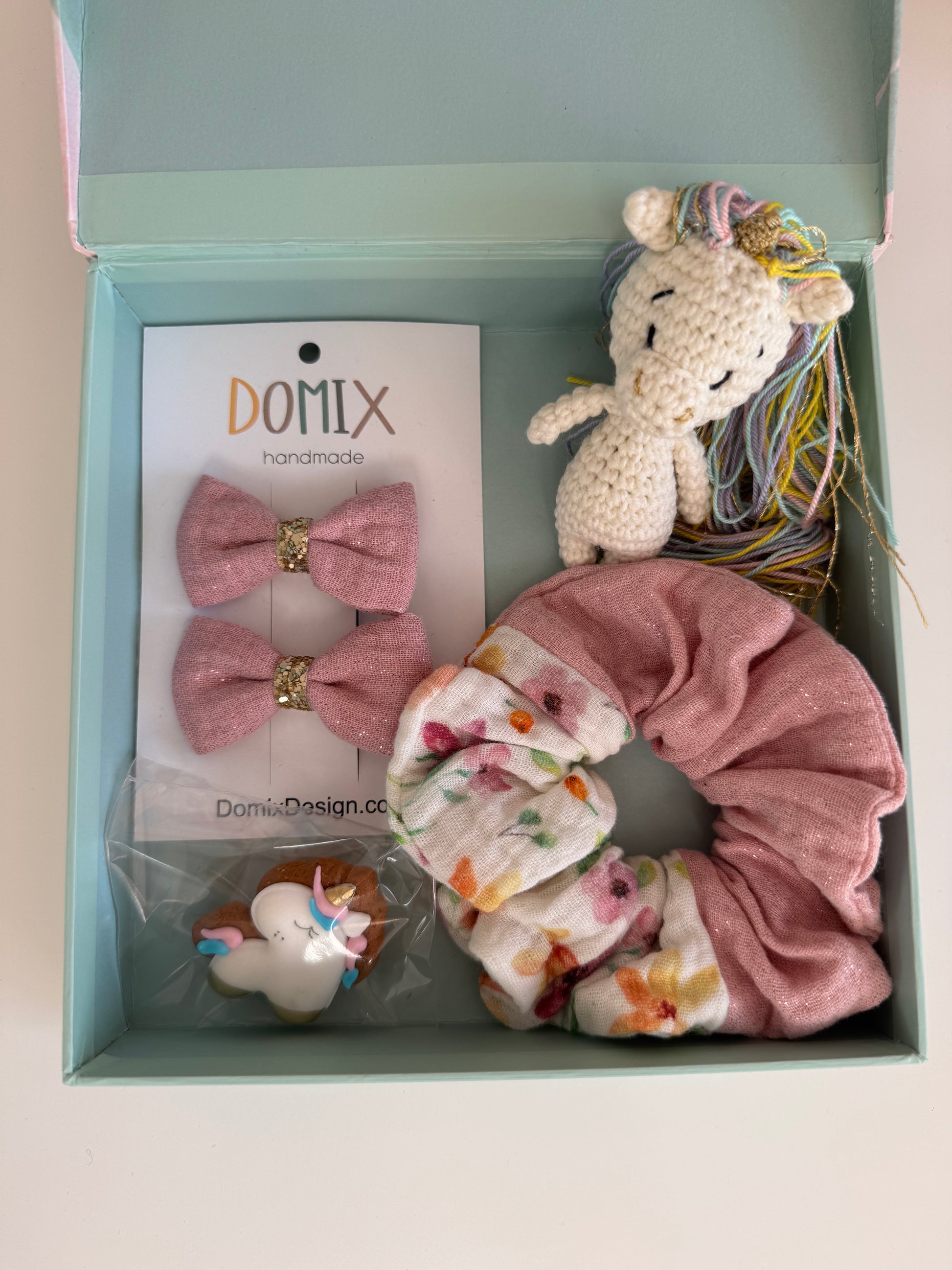 The set includes two elegant handmade hair bows, soft muslin scrunchies, and a charming crochet unicorn toy made from cotton yarn. To make the gift even more special, the box also includes a small biscuit treat for the parents.