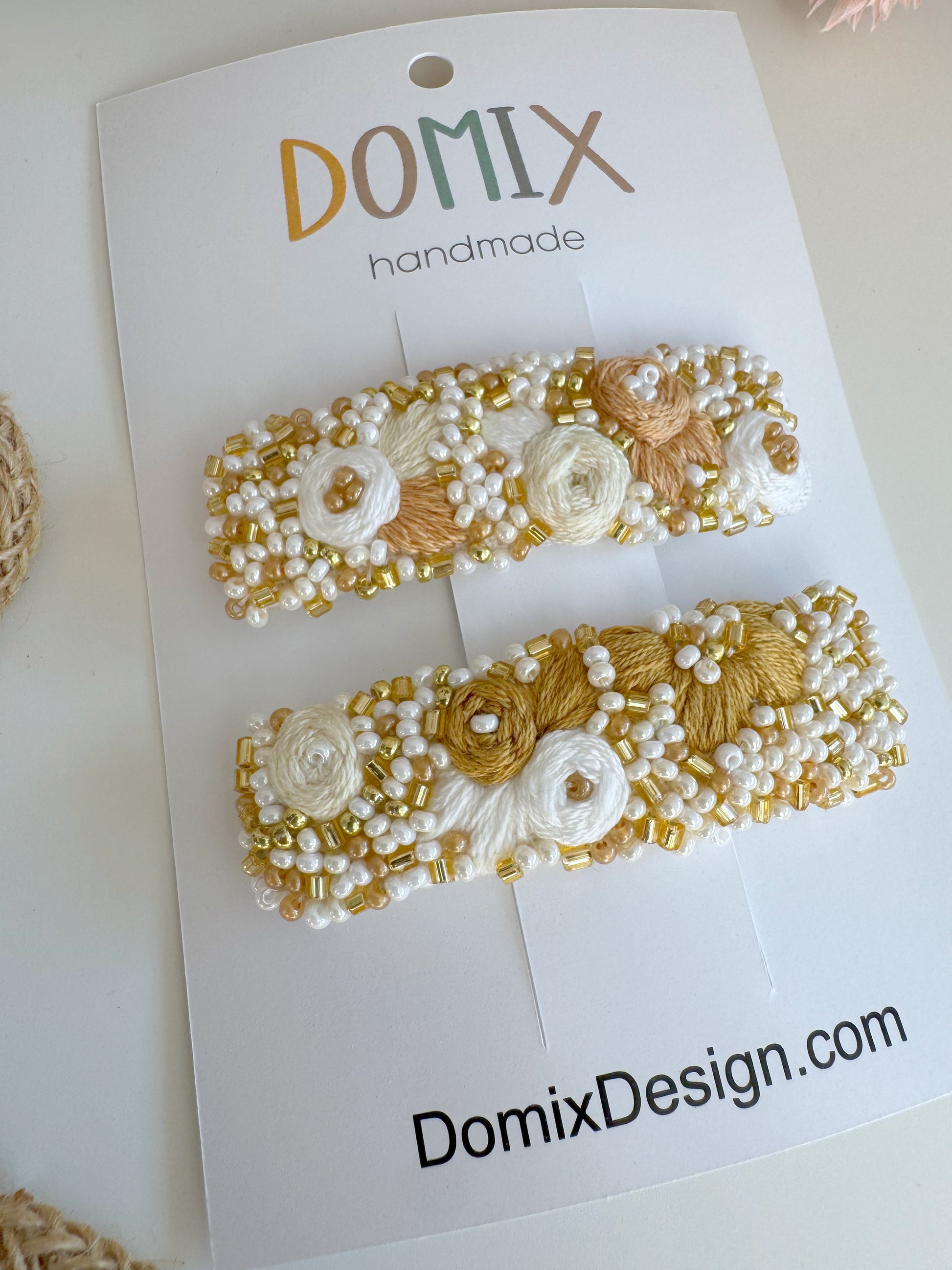 Beautiful set of two handmade hair clips featuring a delicate combination of fine beadwork and detailed thread embroidery. Each piece is carefully crafted to create texture, dimension, and a refined handcrafted finish.